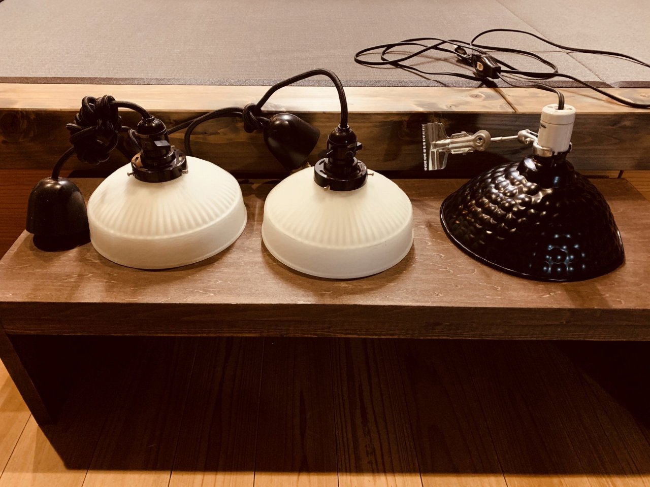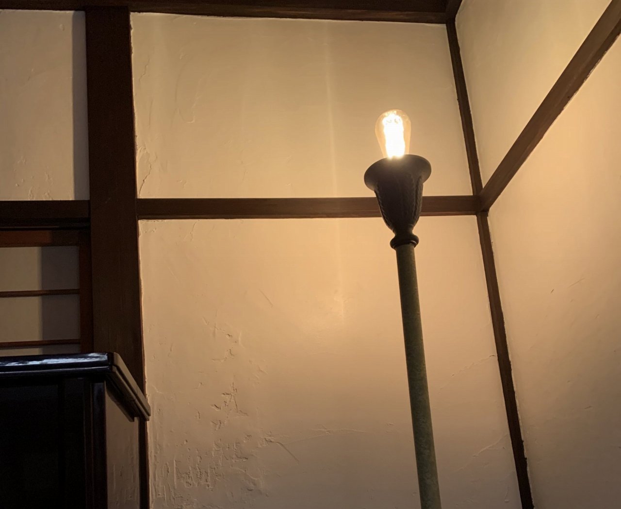 和室のフロアスタンドとダイニングのペンダントライト。どちらも古いもので古道具屋さんで見つけました