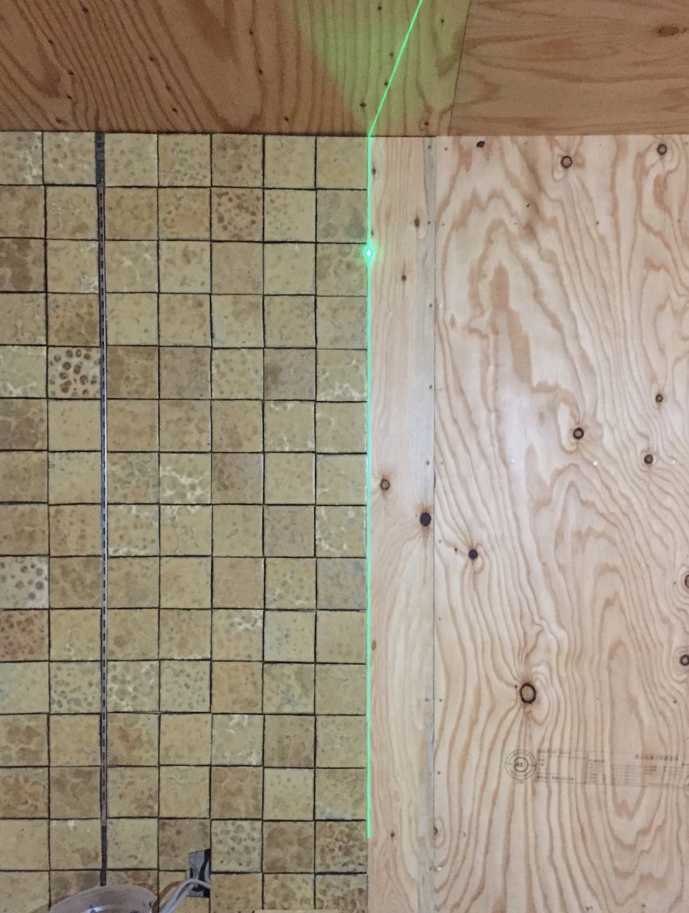 北側にタイルを貼ります。割付中。ガチャ柱(シルバー)は棚受けの金具です