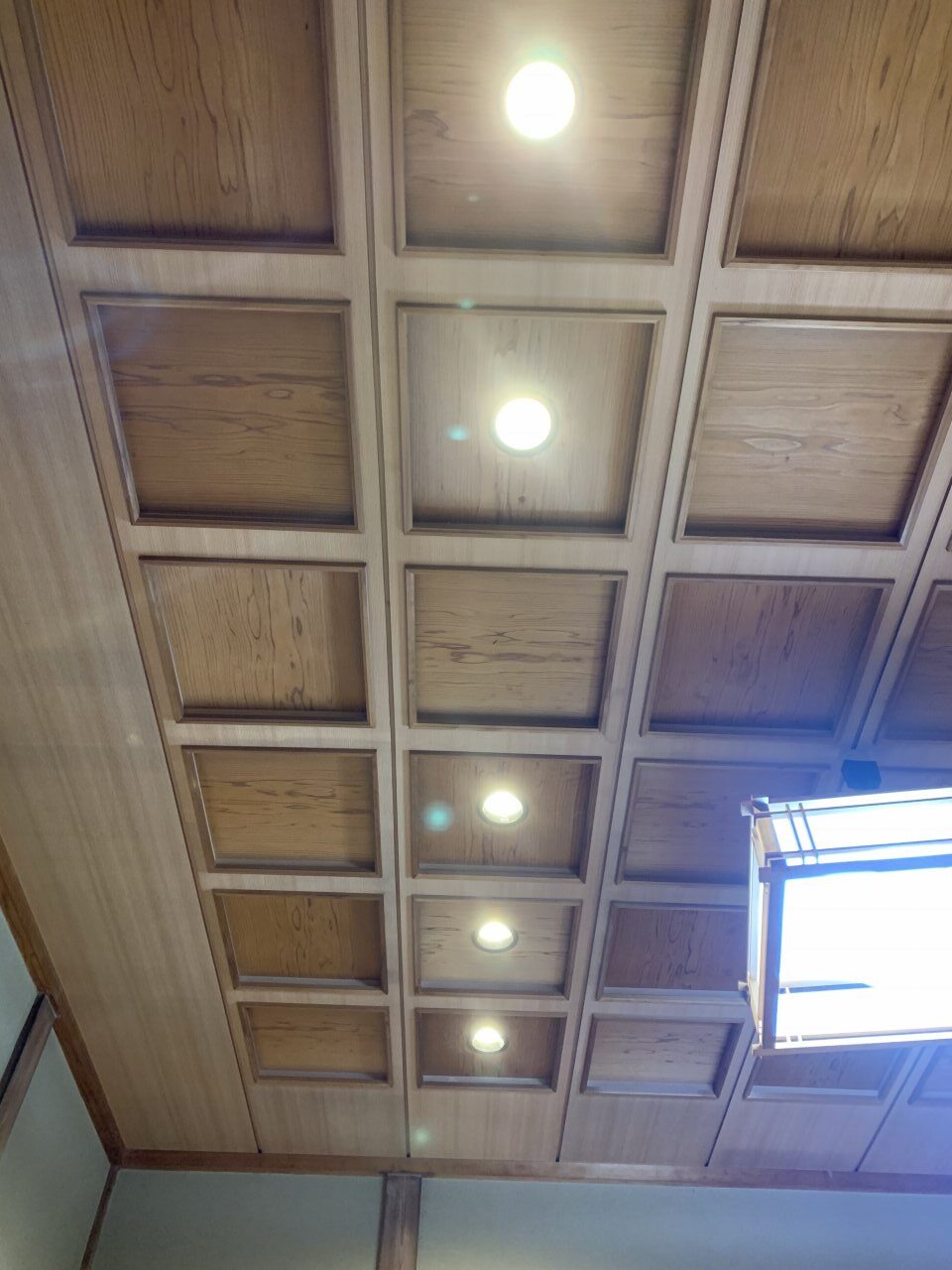 格天井にダウンライトをはめ込みました