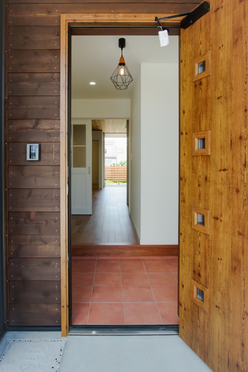 いつも笑顔の絶えないご家族のイメージに合わせて玄関前壁一面をタイルで装飾しました。
